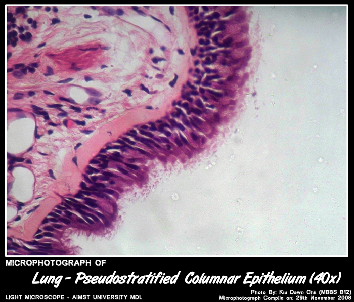 Epithelium – Simple columnar with cilia & goblet cells.